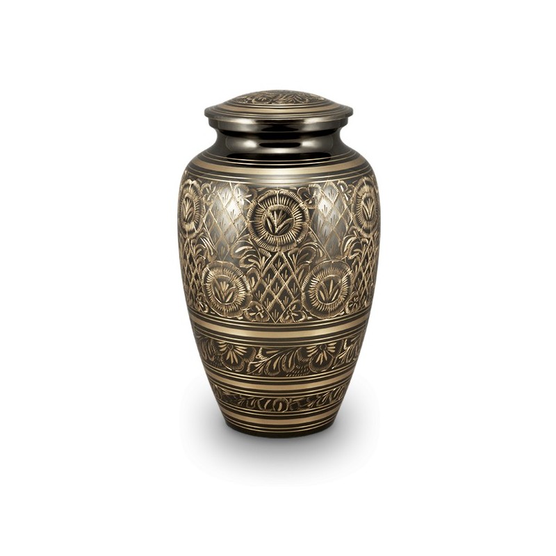The Nirvana brass cremation urn was crafted and hand-decorated by skilled artisans in the city of Moradabad, in Uttar Pradesh, India. This urn comes with a screw-top lid that can be sealed.